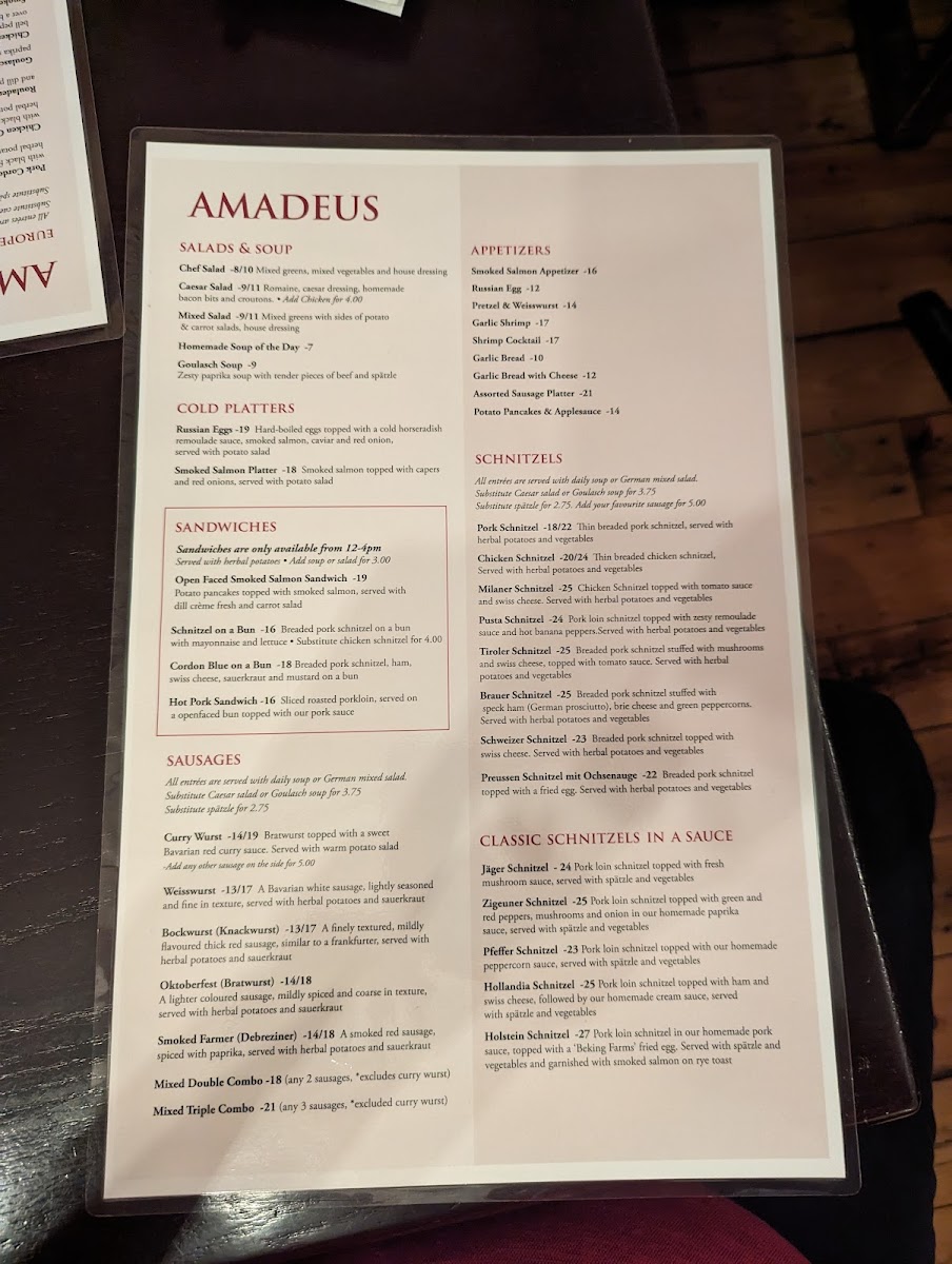 The menu at Amadeus Cafe is a carefully curated selection of European classics that are both hearty and satisfying. Highlights include the Veal Cordon Bleu, Hungarian Goulasch, and the renowned Schnitzel served with delightful spätzle— a must-try for any serious foodie. Each dish reflects the rich flavors and quality ingredients that are synonymous with traditional European cooking.